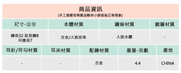 ◆合金飾品一經使用可能隨時間失去光澤或褪色,此為正常物理現象,妥善使用保存可延長飾品壽命。