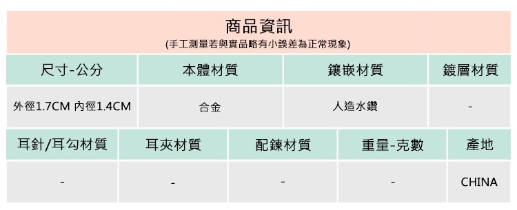 ◆合金飾品一經使用可能隨時間失去光澤或褪色,此為正常物理現象,妥善使用保存可延長飾品壽命。