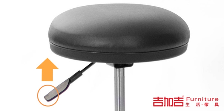 高度調整︰調整高度時,人請先離開座墊,請向上拉坐墊前緣的圓盤拉桿,即可將座墊昇起,若需調降高度,人則需坐在座墊上,請向上拉坐墊前緣的圓盤拉桿,透過身體重量,座面高度即可下降。