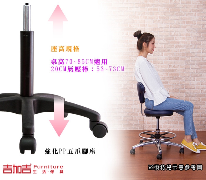 本款基本搭配20CM升降吧台型氣壓棒,針對一般桌面70-85CM以下使用,適合製造業、加工廠業者設計, 且使用台灣工廠製造,氣密度好,不易漏氣損壞,或發生氣爆的危險,安全無虞,可放心使用(訂購前請注意,座高請依照需求訂購)。