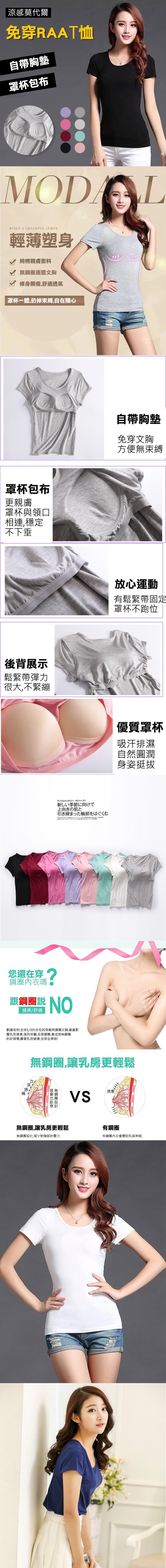 涼感莫代爾免穿braT恤 吸汗速乾Bra短袖T恤,選用天然素材,親膚透氣,吸汗透氣。罩杯一體式設計,免穿內衣,無束縛感,舒適好穿!外出穿也完全沒問題!簡潔圓領,修身顯瘦!現有多色任選喔!