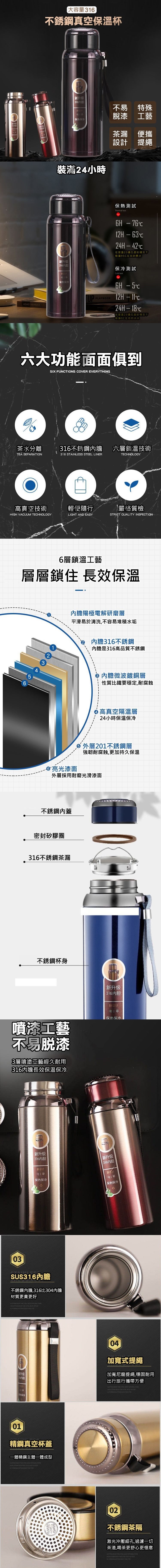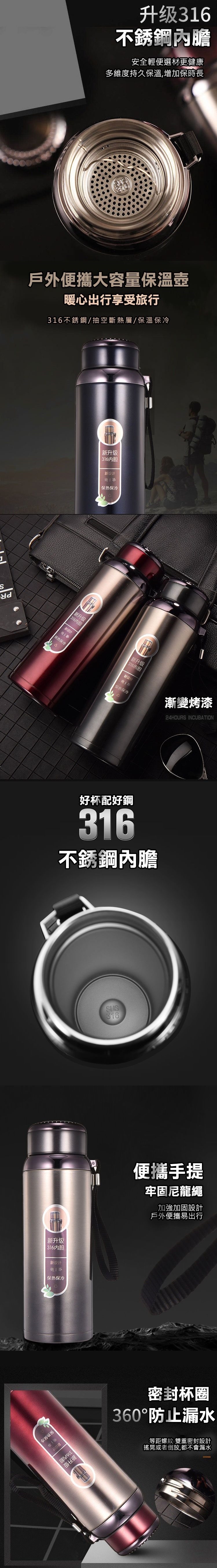 大容量316不銹鋼真空保溫杯,雙重保溫保冷,讓你隨時享受溫熱的水,室內戶外都適用,家裡、車內、辦公室、上學、登山、釣魚、海邊、健行、野營、旅行、逛街...,隨時來上一杯熱騰騰的咖啡或美茶,真是人生一大享受!寒冬來上一杯