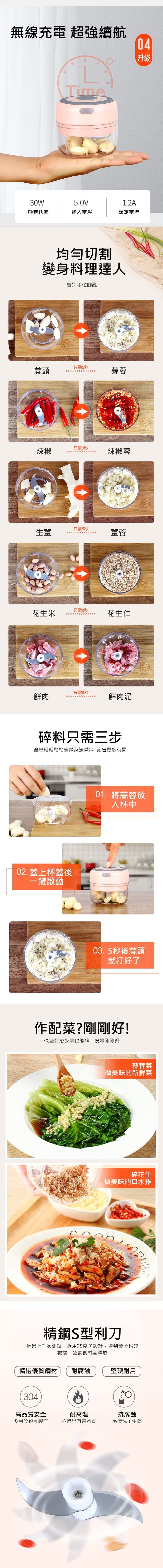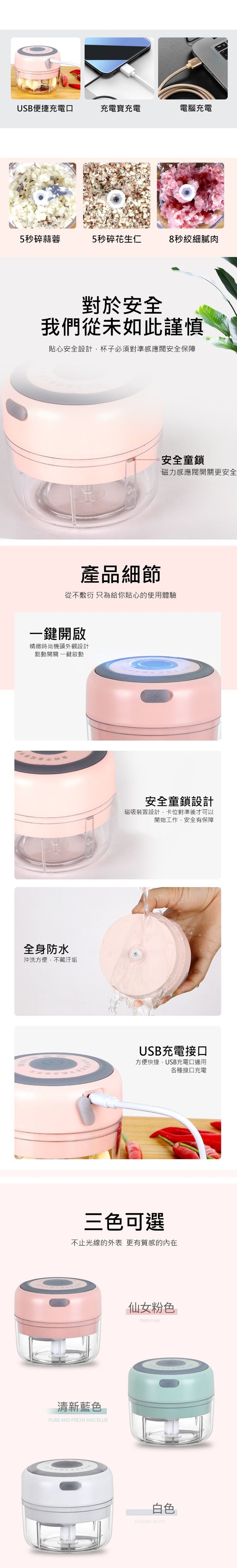 升級款 電動免手拉迷你切菜搗碎機 打蒜/薑/辣椒/絞肉/多種副食處理 .強力不鏽鋼刀片,10秒可碎食 .電動操作,比手拉式更快速省力 .安全童鎖設計,避免兒童誤觸 .支援USB,行動電源也能充電