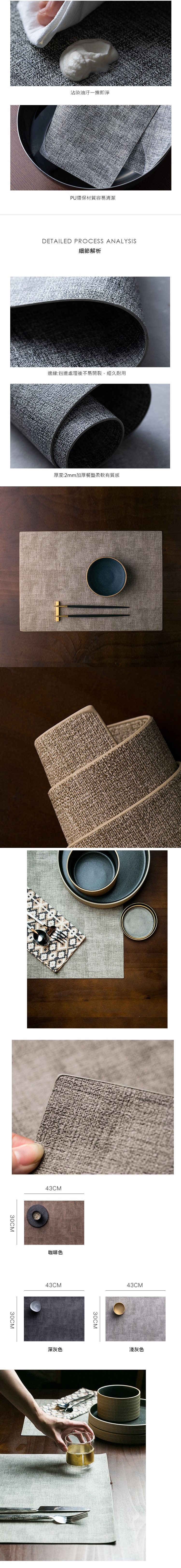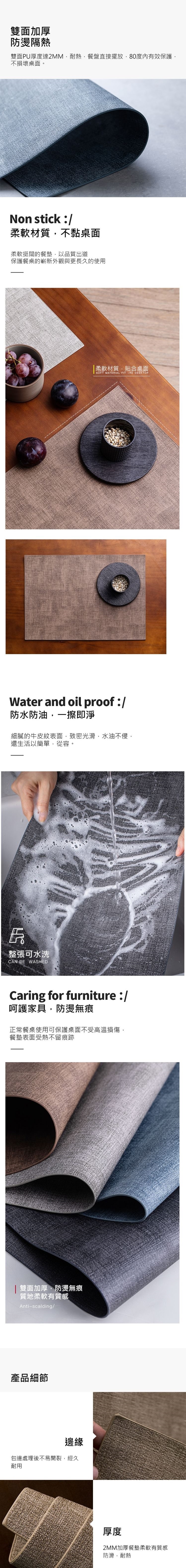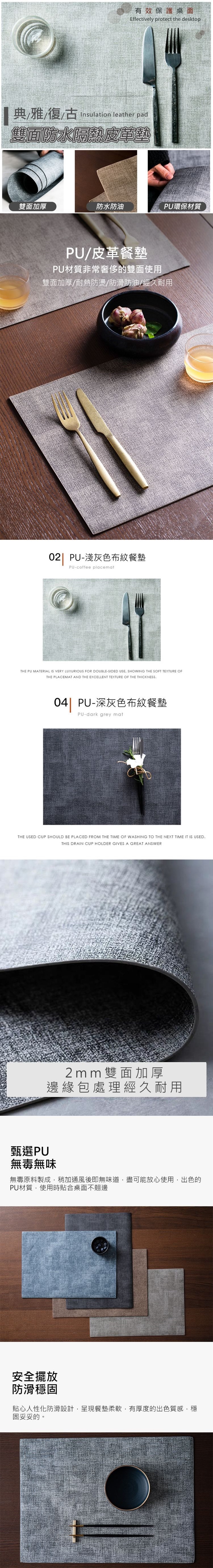 典雅復古雙面防水隔熱皮革墊,採用優質PU皮為主要材料,防油、防污、防滑、抗菌、耐熱、耐磨、防水。把他放在桌面上墊杯子、餐具等,燙壞檯面,即可防止餐桌打滑、同時又兼具美觀大氣。歐式簡潔大方、素淨高雅,亦可放在花瓶、煙灰缸等等下做襯托喔。好看更耐用實用的餐墊!就要這一升級款喔!現有多色可選