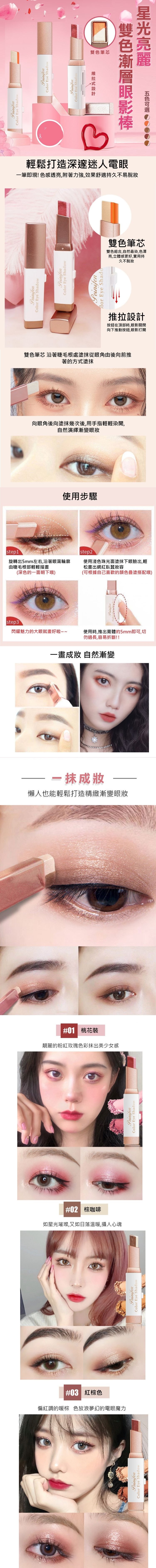 全新升級款 星光亮麗雙色漸層眼影棒,雙色深淺眼影,一抹成形,懶人也能輕鬆打造精緻眼妝;