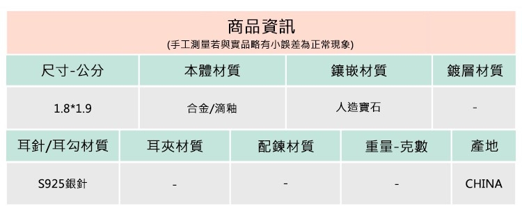 ◆合金飾品一經使用可能隨時間失去光澤或褪色,此為正常物理現象,妥善使用保存可延長飾品壽命。