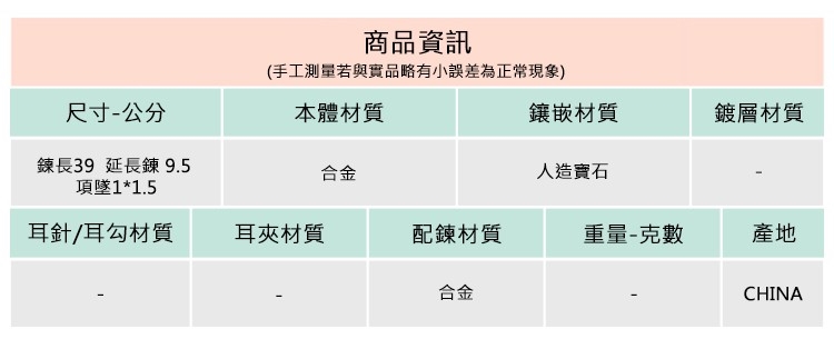 ◆合金飾品一經使用可能隨時間失去光澤或褪色,此為正常物理現象,妥善使用保存可延長飾品壽命。