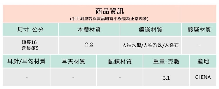 ◆合金飾品一經使用可能隨時間失去光澤或褪色,此為正常物理現象,妥善使用保存可延長飾品壽命。