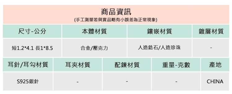 ◆合金飾品一經使用可能隨時間失去光澤或褪色,此為正常物理現象,妥善使用保存可延長飾品壽命。