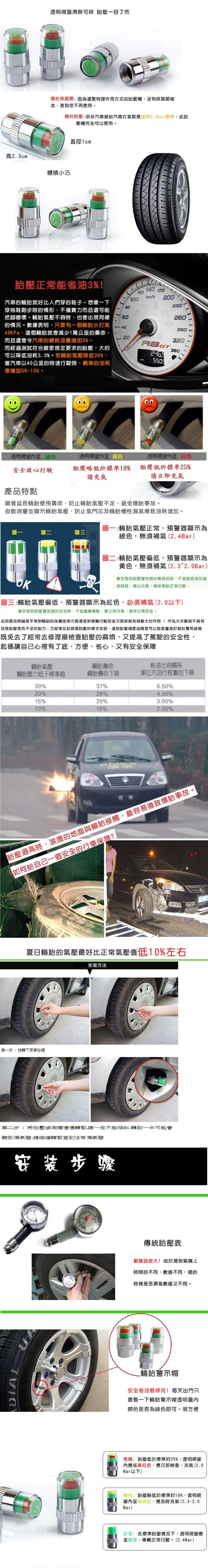 許多行車意外常是爆胎所導致,防止輪胎氣壓不足則需要有胎壓檢測器來幫忙保障安全~採用不鏽鋼材質,不怕風吹日曬!在正常情況下透明視窗為綠色,若是胎壓低於標準約25%則會呈現黃紅色警示,簡單明瞭好操作~輪胎正常更省油!最重要的是安全看的見!