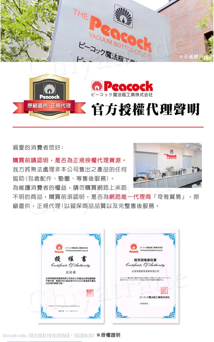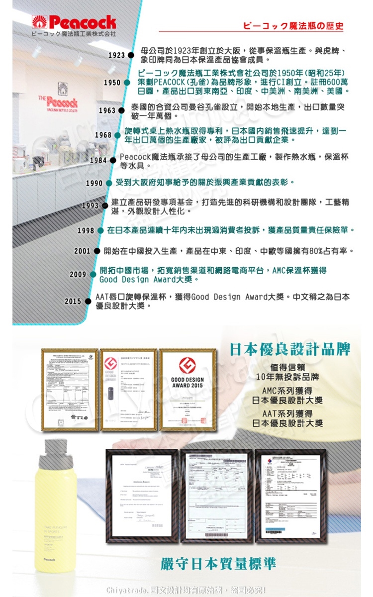 日本孔雀Peacock母公司於1923年創立於大阪,從事保溫瓶生產。與虎牌、象印牌同為日本保溫產品協會成員。