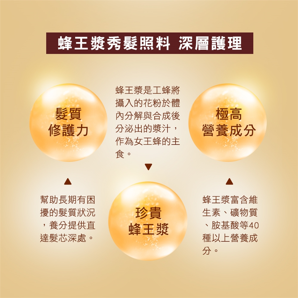 光澤強韌 蜂王漿含有豐富維生素、蛋白質能深入髮絲,呵護頭髮散發光彩。