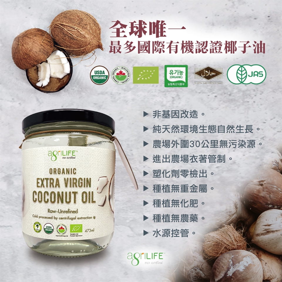 AgriLIFE,是產自泰國經冷壓「初榨」,且是有機認證USDA ORGANIC 100%有機成分。
