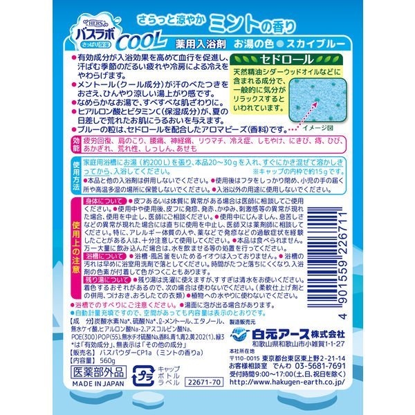 護膚型粉狀藥用沐浴鹽。含有鬆弛精華香氣。以光滑浴質包含透明質酸和維生素C(保濕成分)。令有額外的薄荷香氣。