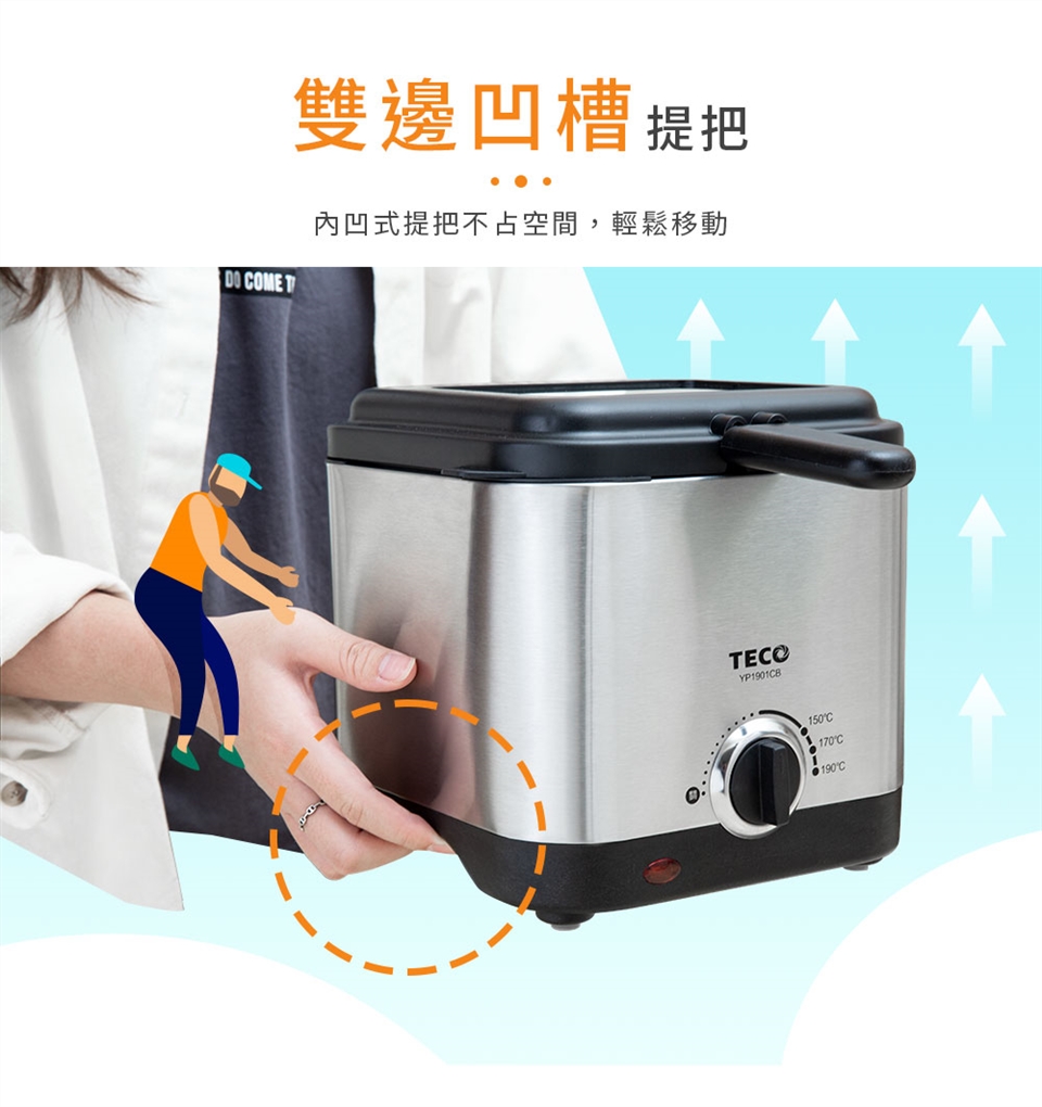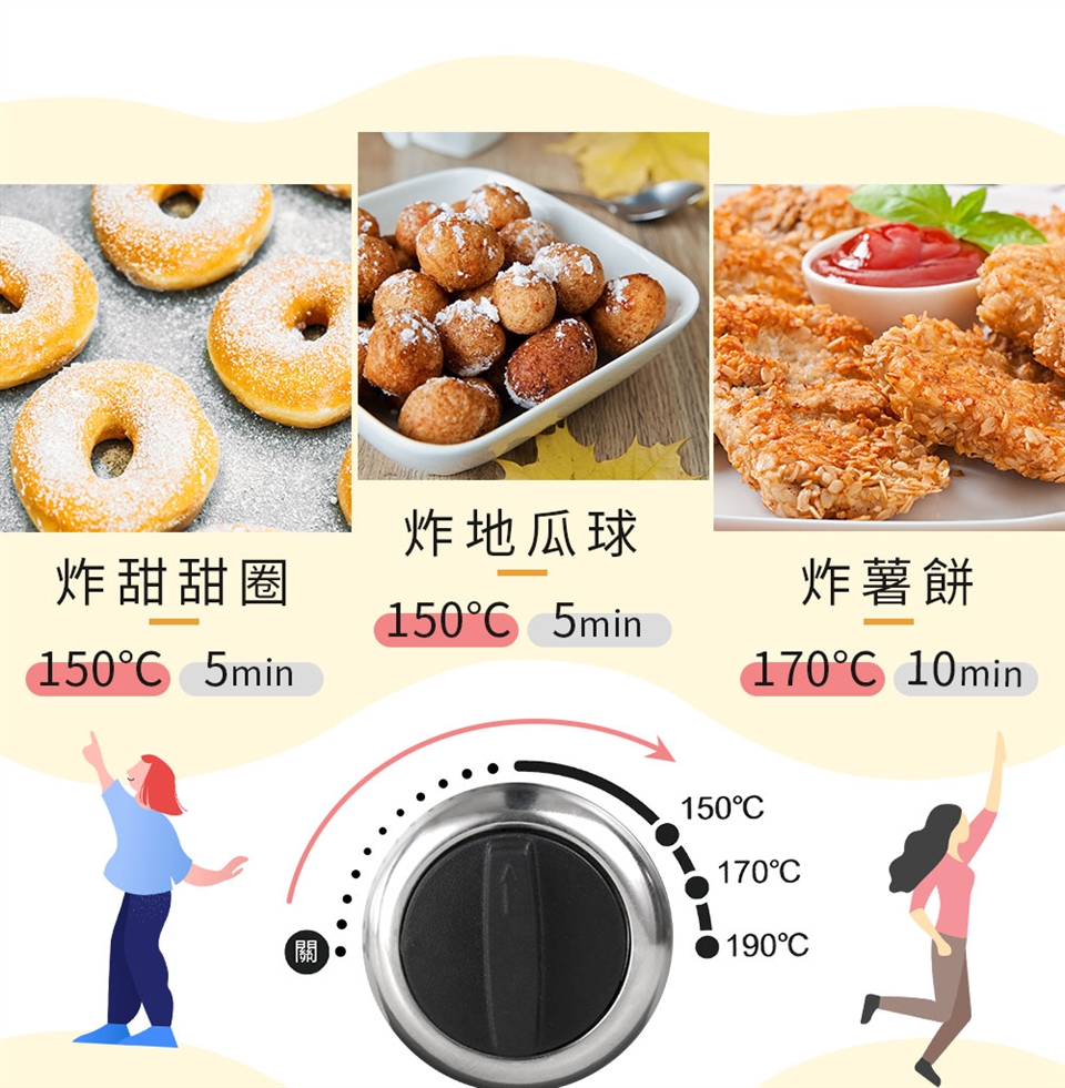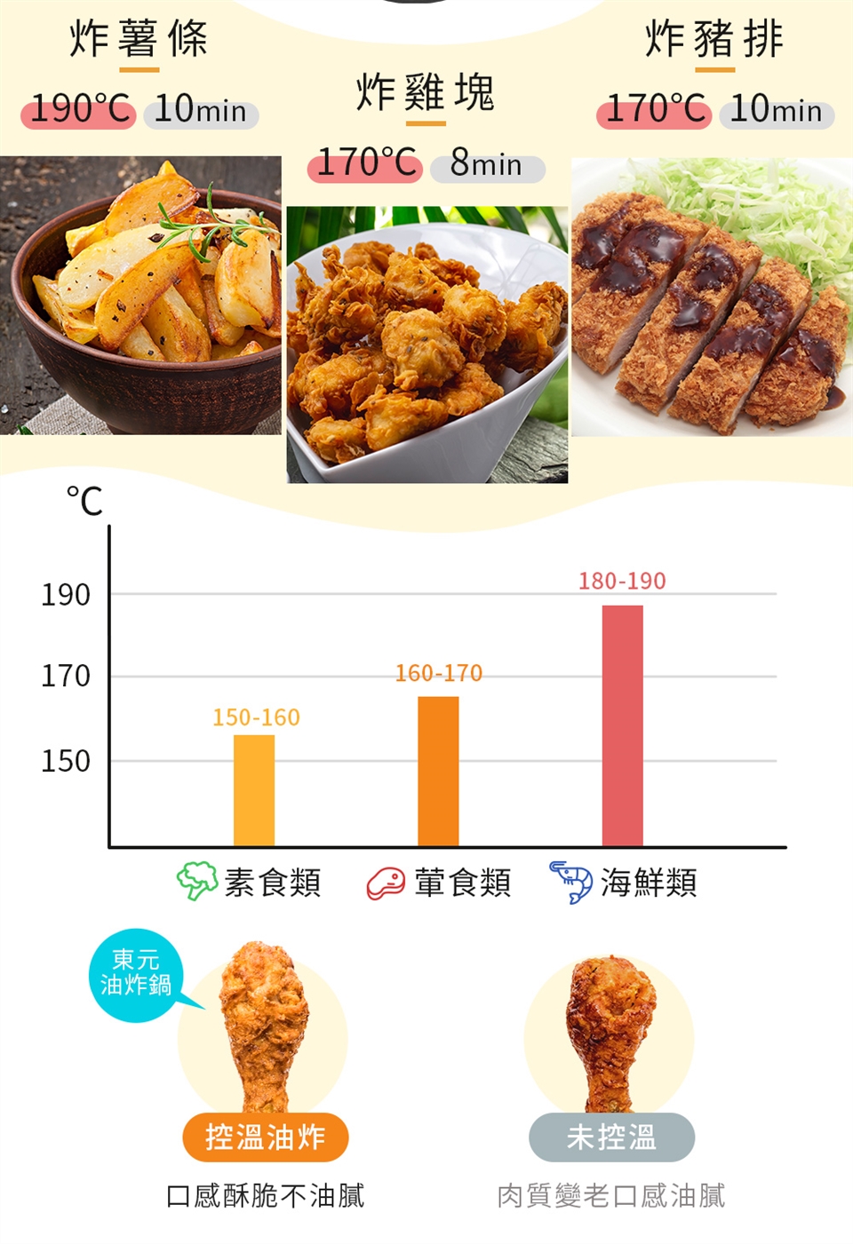 ◆150°C/170°C/190°C多種溫度選擇,可精準控制油溫,不論是炸蔬食、肉類、海鮮都能輕鬆搞定,口感酥脆不油膩。