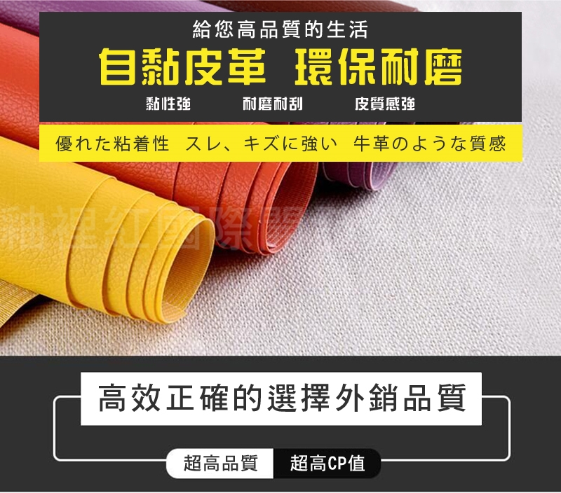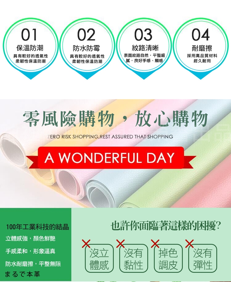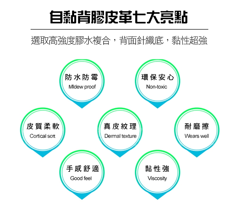 特點:使用方便、揭開即粘、黏性強不易脫落、皮質感強、防水性好