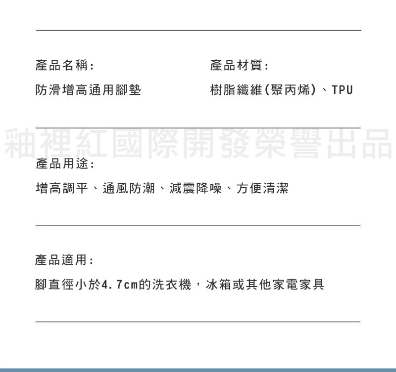 產品適用:腳直徑小於4.7cm的洗衣機,冰箱或其他家電家具