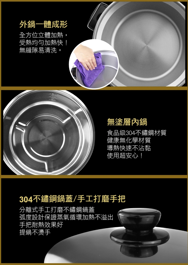 ◎鍋蓋、內鍋皆304不銹鋼材質精製而成,堅固耐用