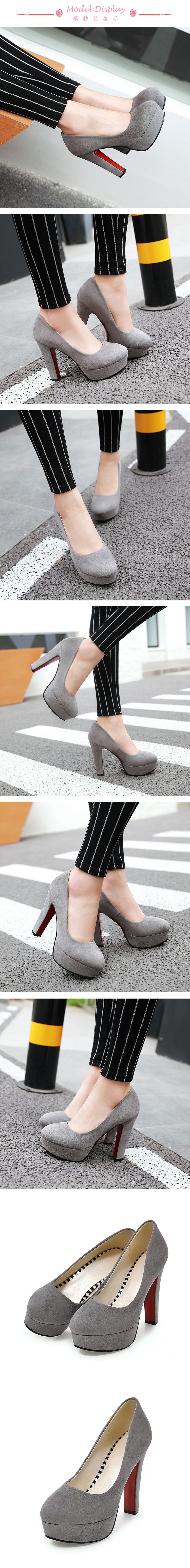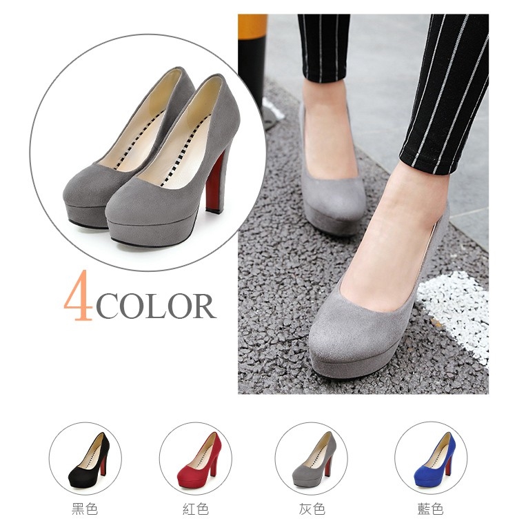 【Kissxxx】粗跟鞋圓頭跟鞋/氣質絨面淺口小圓頭防水台高跟鞋 灰