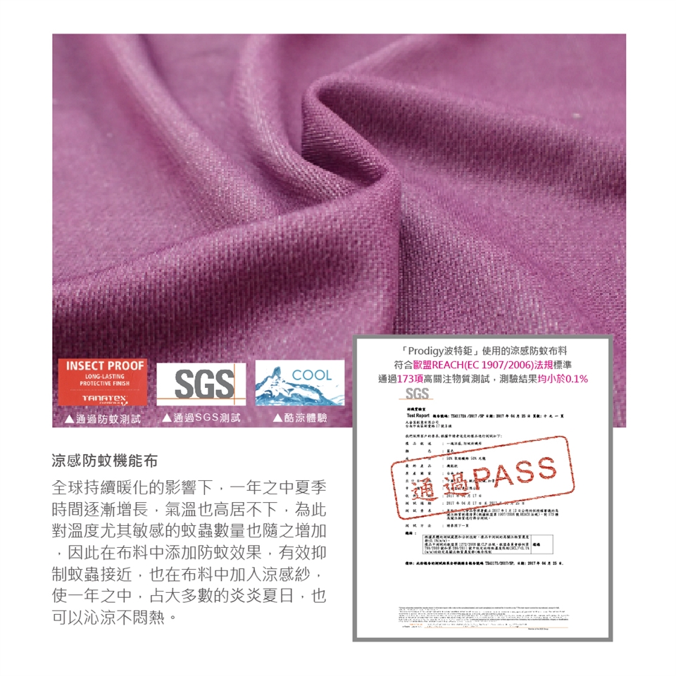 ③ 經"荷蘭TANATEX"檢驗合格防蚊蟲布料,高效防護蚊蟲叮咬,無味、無刺激、耐水洗、對人體無害可安心使用