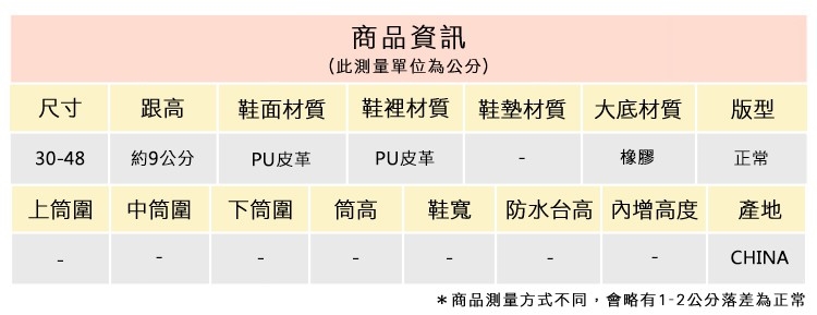 2.鞋類商品依功能及用途之不同,鞋底各有其止滑係數之個別不同,使用鞋類商品請用於正常平坦之路面,非雨鞋或雨靴類商品,請避免穿著於下雨濕滑路面上行走。