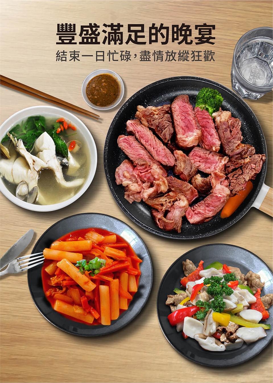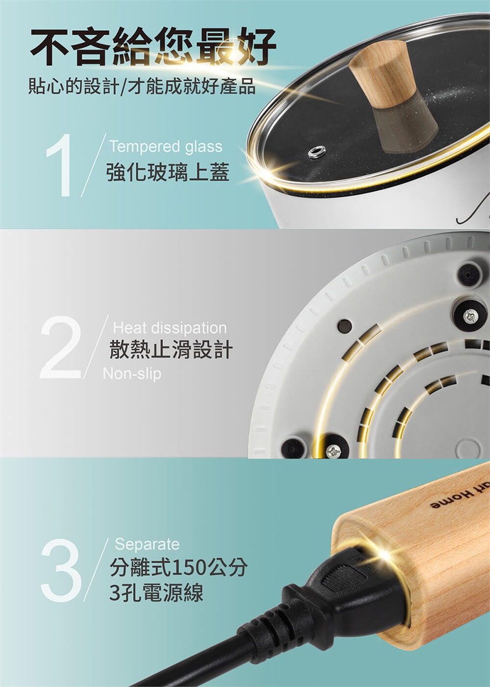 包裝內容物:不沾平底鍋X1 + 強化玻璃蓋X1 + 分離電源線X1 + 說明書X1