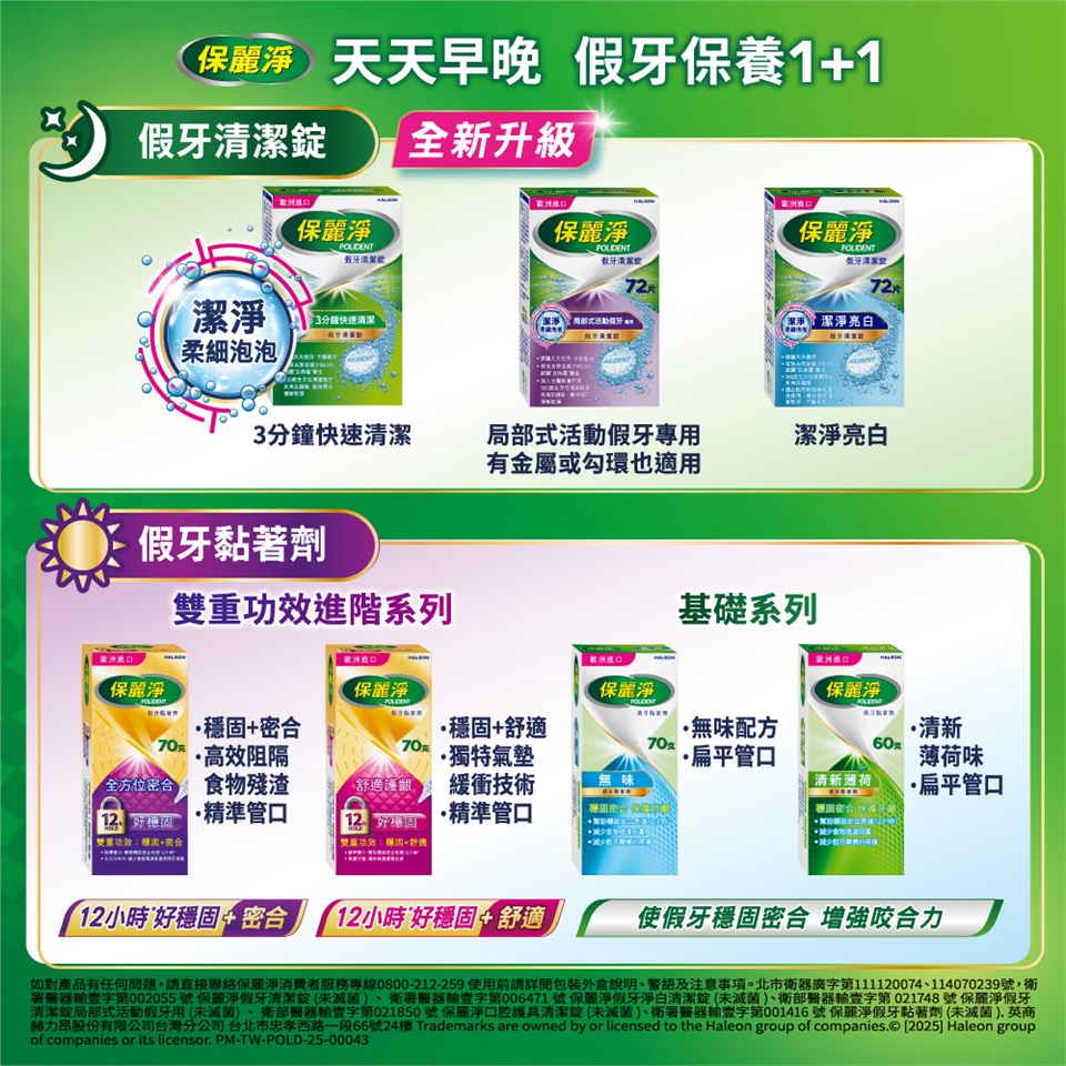 6.針對全口假牙配戴者,若您的假牙有鬆動問題,建議搭配保麗淨假牙黏著劑。