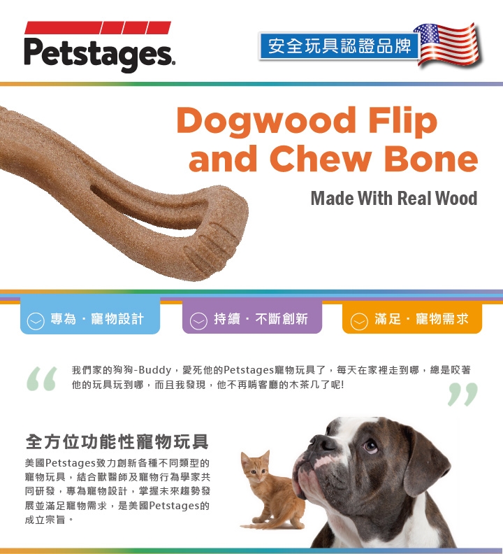 Petstages擁有許多專利創新設計,提供安全且獨特的產品,通過特殊包裝與專屬說明,幫助寵物主人瞭解如何選擇適合產品,提供廣泛發展且不斷創新的寵物玩具,協助並滿足寵物及飼主之間的各種需求。
