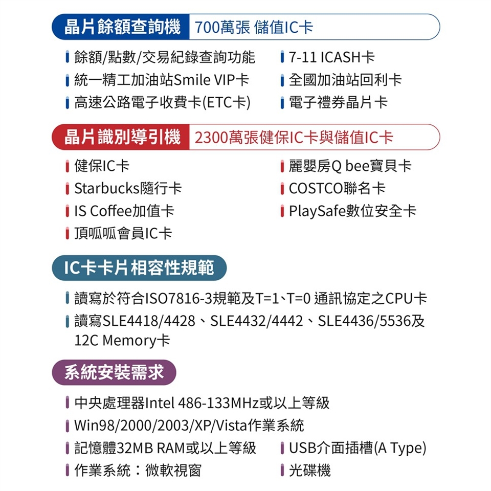 ▸商品相容:與內政部自然人憑證所使用之IC完全相容'且可讀取第二代金融IC卡(FISC II)。