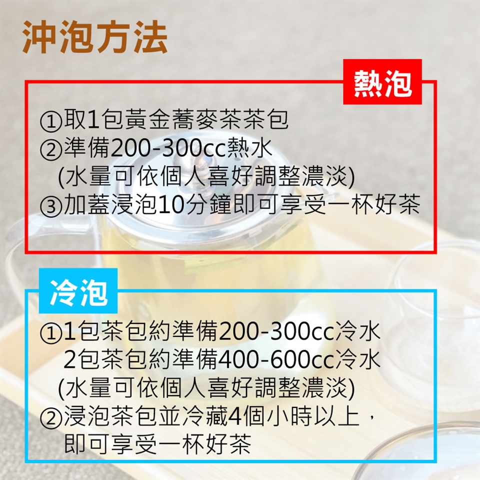 嚴選台灣黃金蕎麥,加上台灣獨有的高山茶,散發自然的香氣,讓茶湯在嘴裡,清香回甘,風味獨特,此為無咖啡因飲茶。