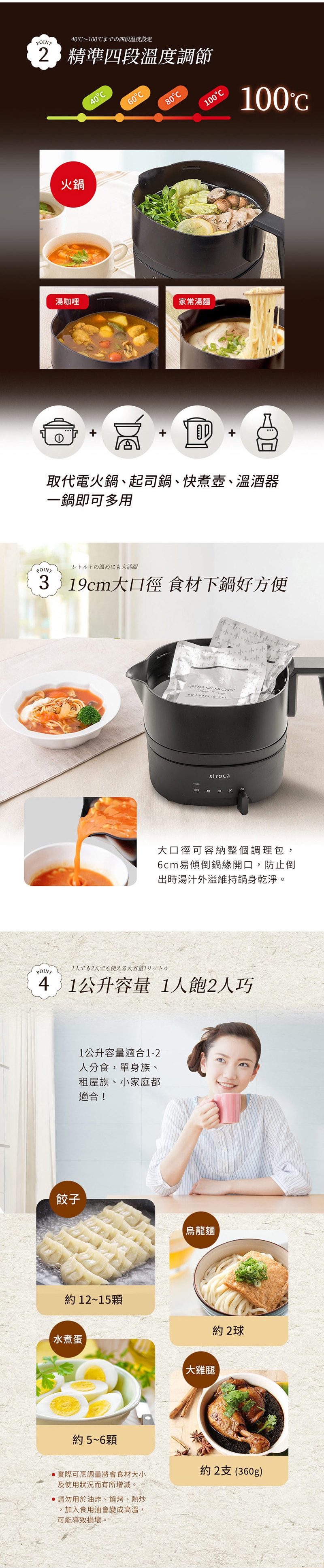◆精準四段溫度調節(40/60/80/100°C),一鍋多用,可取代電火鍋、起司鍋、快煮壺、溫酒器。