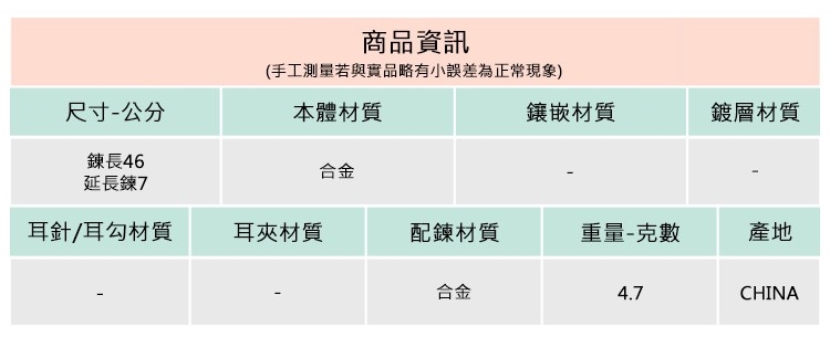 ◆合金飾品一經使用可能隨時間失去光澤或褪色,此為正常物理現象,妥善使用保存可延長飾品壽命。