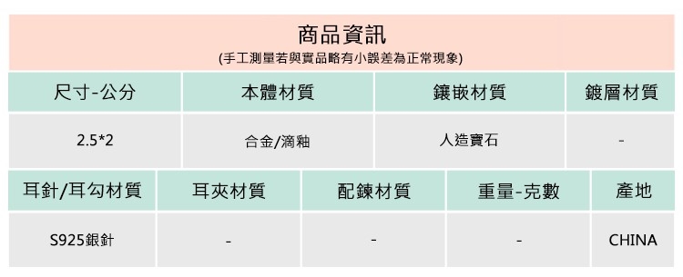◆合金飾品一經使用可能隨時間失去光澤或褪色,此為正常物理現象,妥善使用保存可延長飾品壽命。