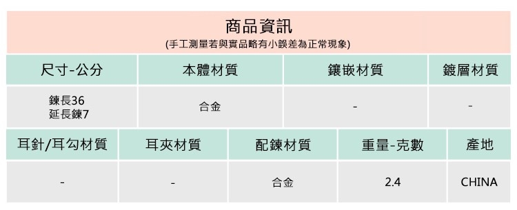 ◆合金飾品一經使用可能隨時間失去光澤或褪色,此為正常物理現象,妥善使用保存可延長飾品壽命。
