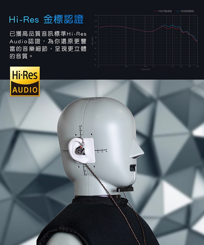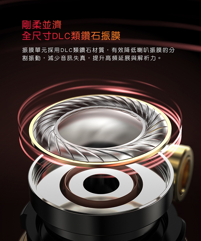 採用12mm DLC類鑽石振膜動圈,有效降低振膜的分割運動,減少音訊失真。