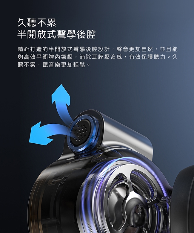 半開放式後腔設計,高效平衡腔內氣壓,讓聲音更自然。