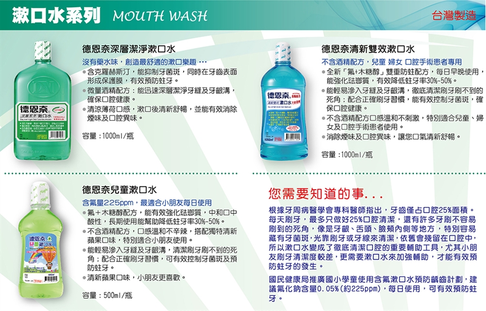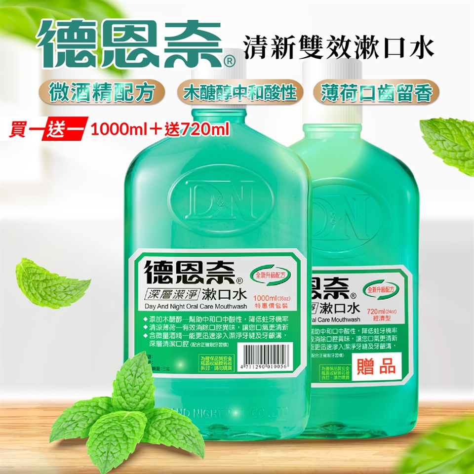 ●本品含微量酒精,不建議口腔手術患者及兒童使用。請另選未含酒清的「德恩奈清新雙效漱口水、德恩奈兒童漱口水」來使用。