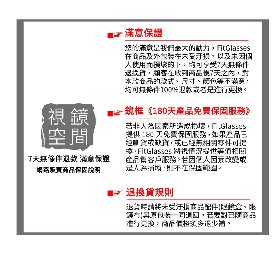 2.拍攝光線強弱、拍攝色溫(5500K),與眼鏡框材質與透度等等因素會導致網站照片(產品與試戴照片)與實物的顏色落差,特別是太陽眼鏡試戴,請以實品為主。