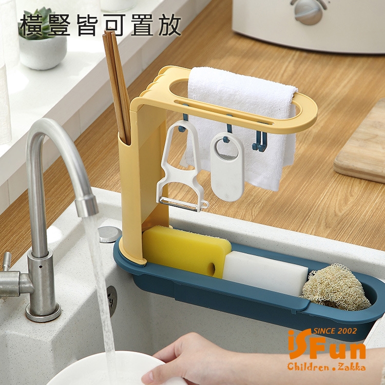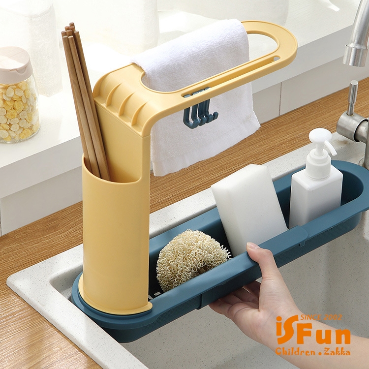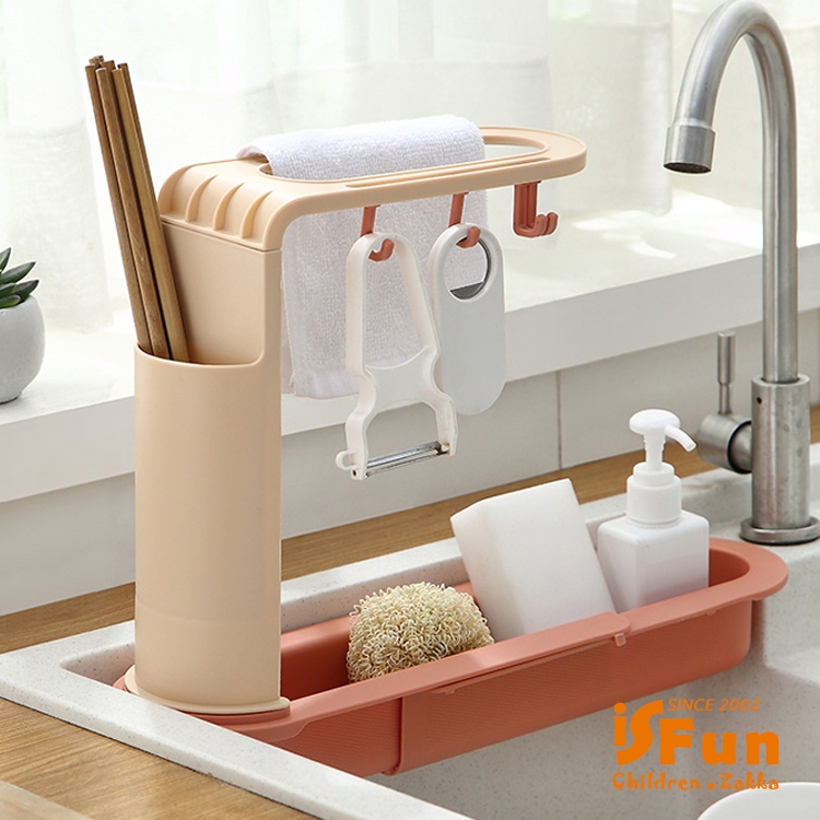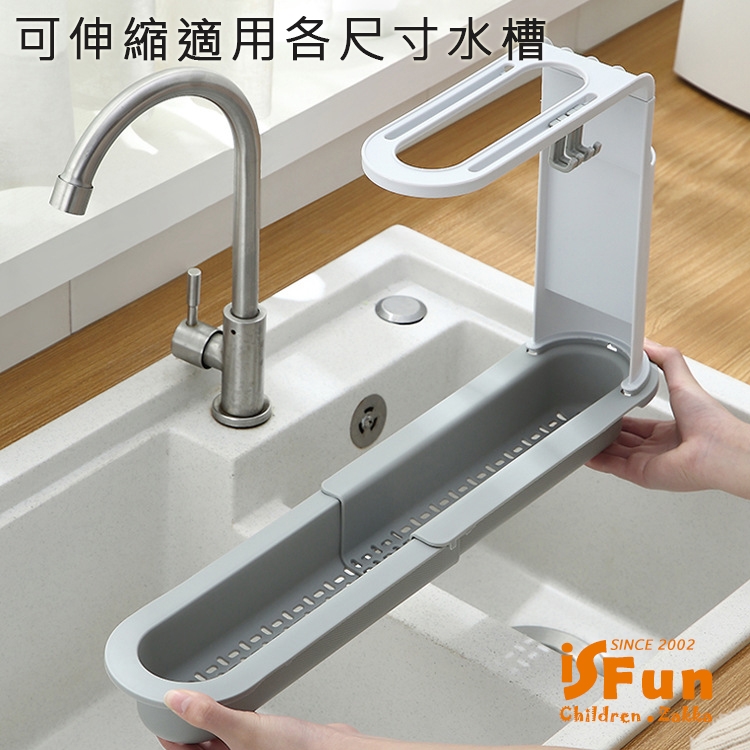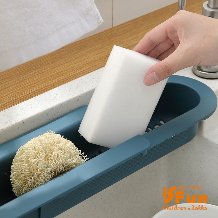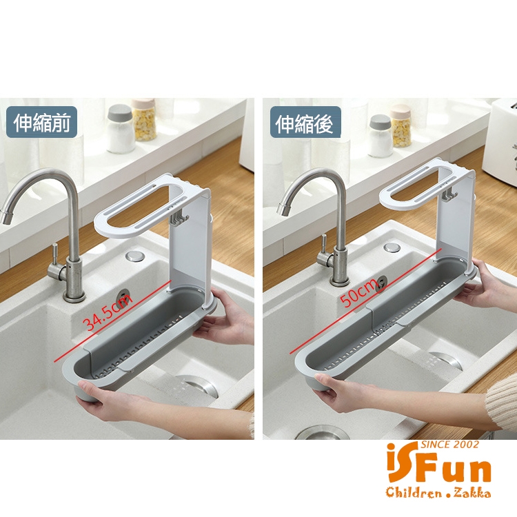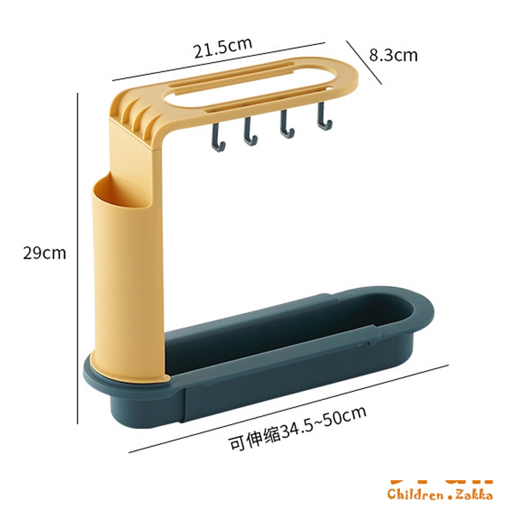 可伸縮約 34.5~50 cm適用,可橫放縱放,清洗時拆卸方便,長型設計不佔水槽空間,