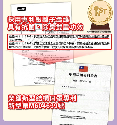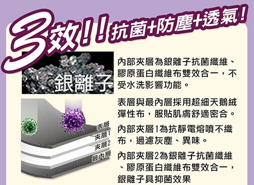 內部夾層2為銀離子抗菌纖維、膠原蛋白纖維布雙效合一,銀離子具抑菌效果,不受水洗影響功能;