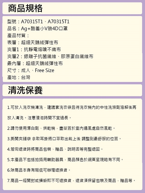 Ag+酷羞小V臉4D口罩(黑色、紫色任選)