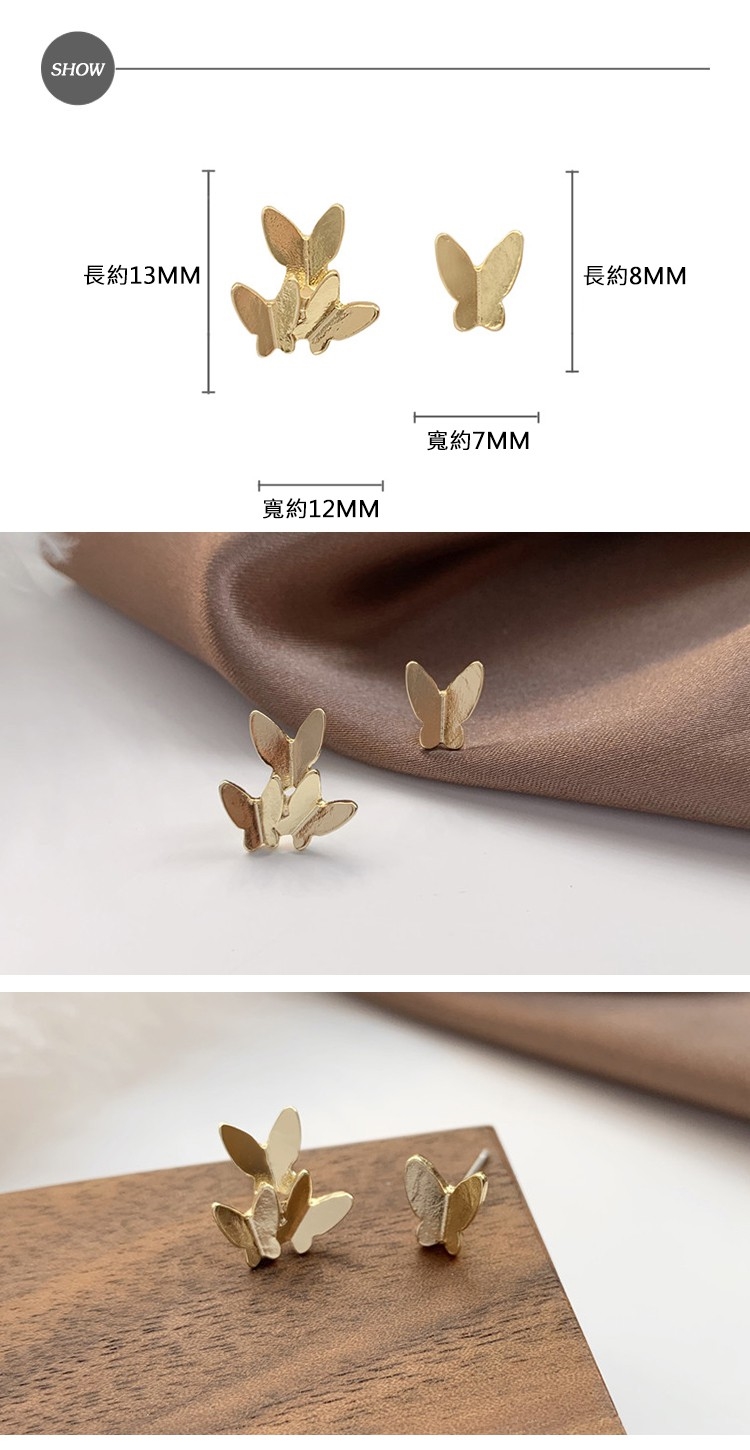 【00:00】韓國設計S925銀針不對稱立體金屬蝴蝶耳環