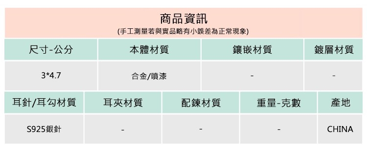 ◆合金飾品一經使用可能隨時間失去光澤或褪色,此為正常物理現象,妥善使用保存可延長飾品壽命。