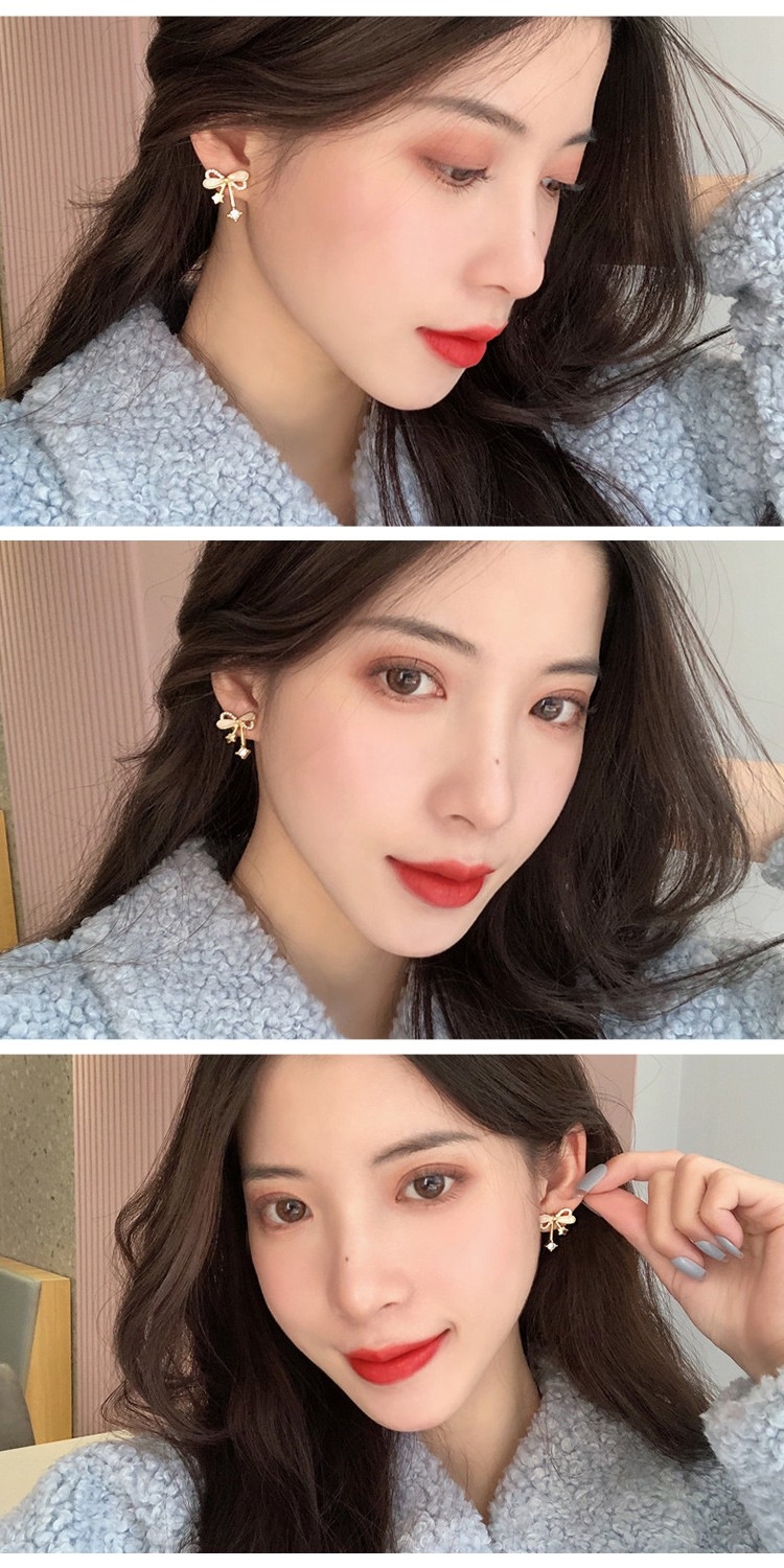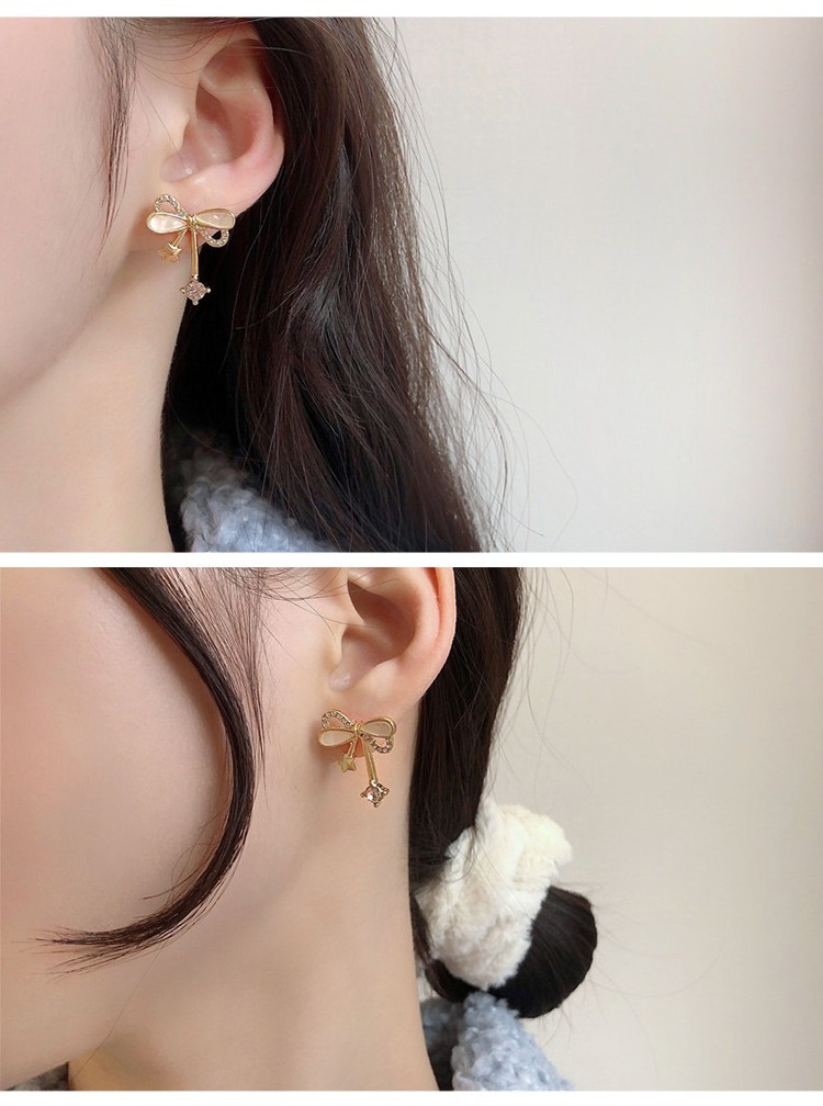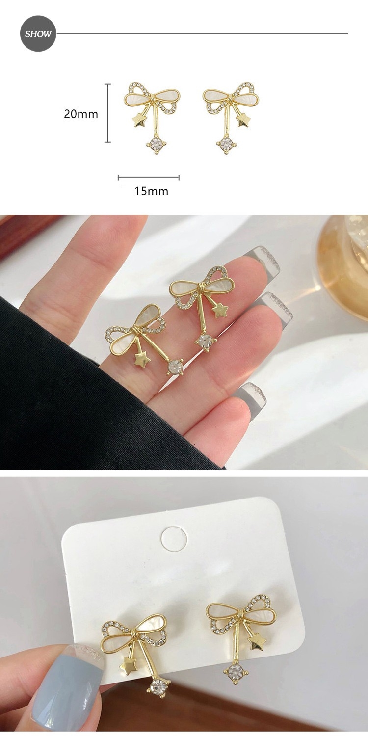 【SECRET BOX】韓國設計S925銀針甜美鑲鑽星星蝴蝶結造型耳環