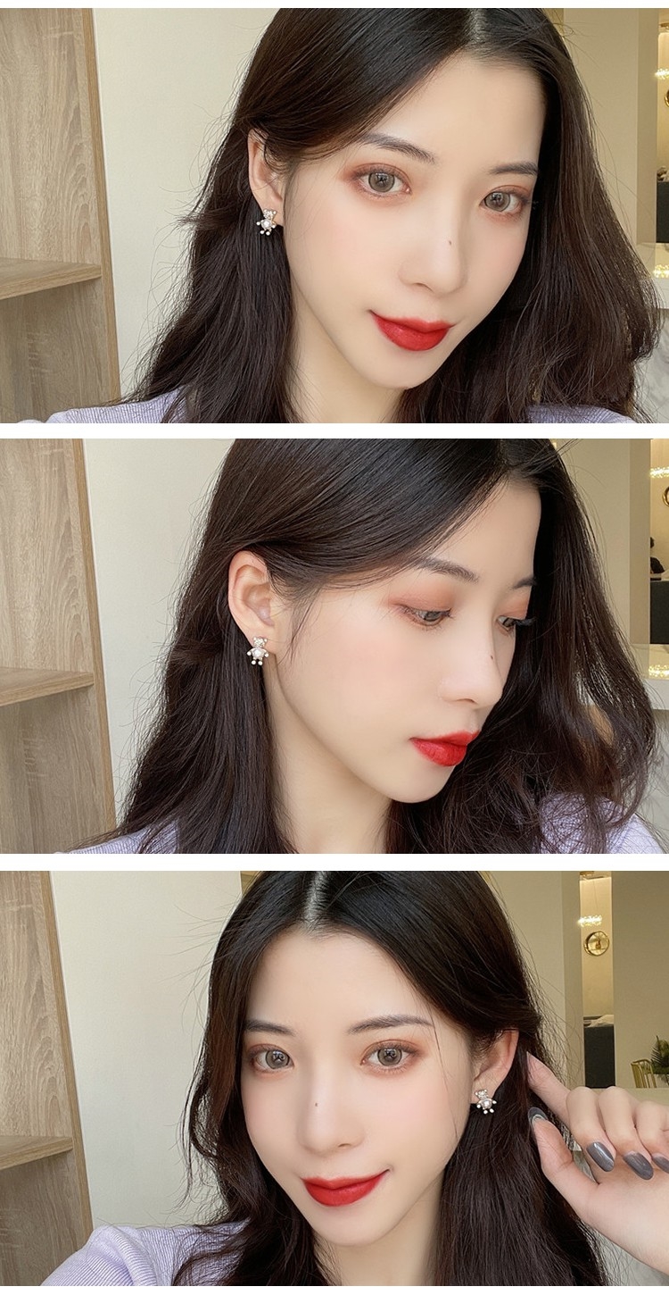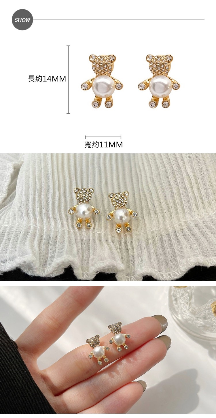 【SECRET BOX】韓國設計S925銀針可愛滿鑽小熊珍珠耳環