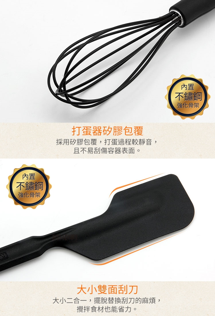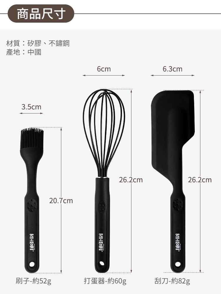 1.尺寸:刮刀W6.3*L26.2cm、打蛋器W6*L26.2cm、膠刷W3.5*L20.7cm