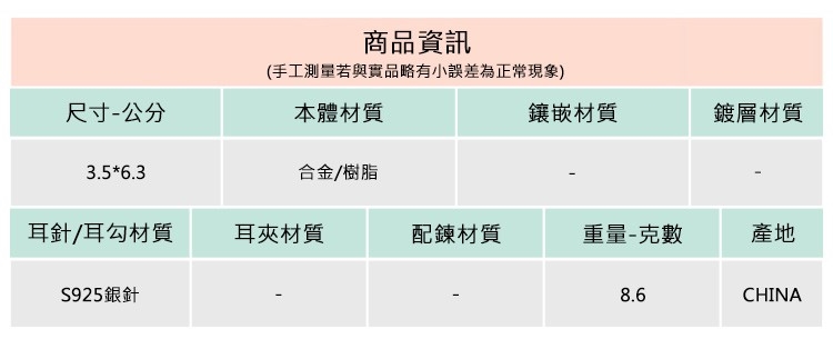◆合金飾品一經使用可能隨時間失去光澤或褪色,此為正常物理現象,妥善使用保存可延長飾品壽命。