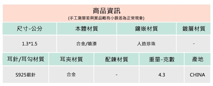 ◆合金飾品一經使用可能隨時間失去光澤或褪色,此為正常物理現象,妥善使用保存可延長飾品壽命。