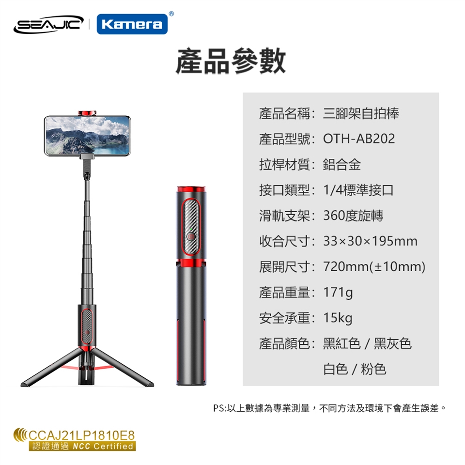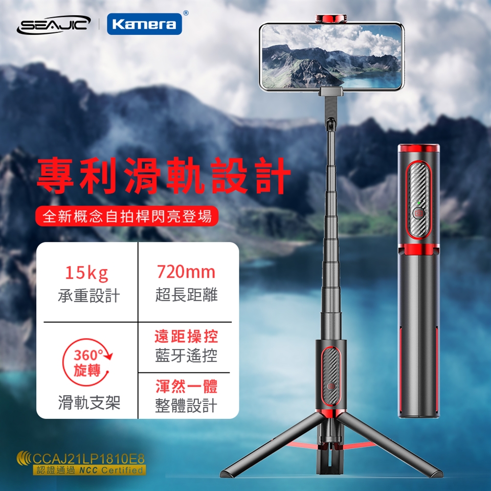 旅遊戶外全紀錄,全身怎麼拍?「三腳架模式」,拉身長達80公分全身入鏡、全角度錄影,穩定清楚。創意構圖怎麼拍?「手持模式」,拉身長達72公分,360度調整旋轉,隨你要的角度皆可拍。不能用手也能拍?藍芽智慧遠距搖控器,10公尺照樣拍。巴黎鐵塔、101照樣拍。口袋一放,跟你走!折疊後不到20cm長,171g微重量。產品特色