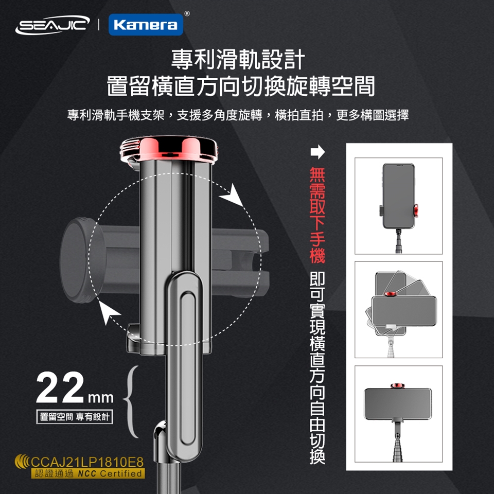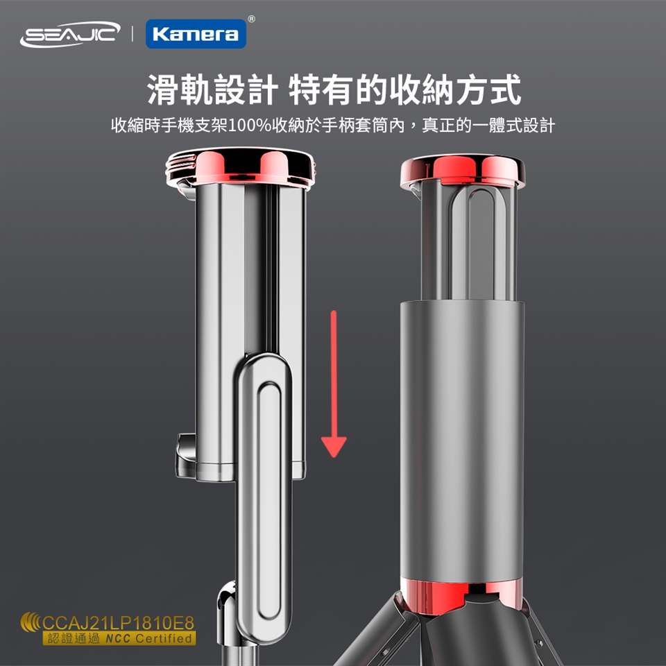- 特有收納方式,手機夾100%收進自拍棒手柄套筒,8段鋁合金拉桿,拍攝更自由